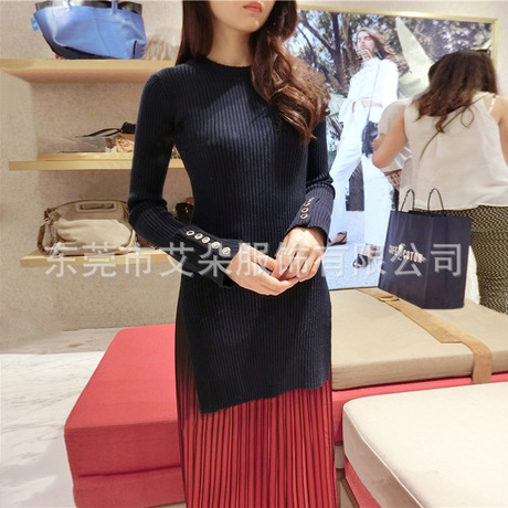 秋冬 英倫風(fēng)金屬扣開衩緊身顯瘦上衣長款針織衫毛衣女 /