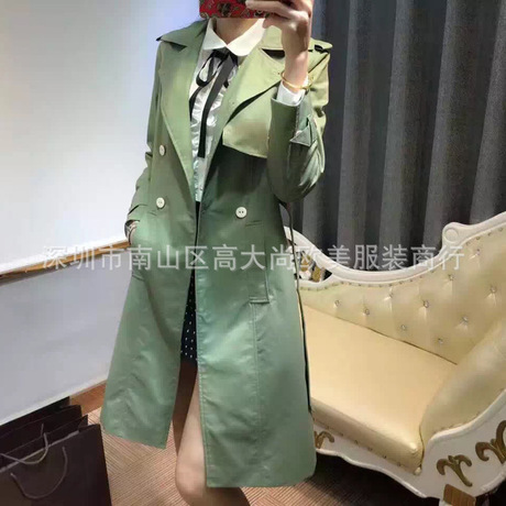 秋季新款B家翻領(lǐng)立體剪裁帥氣軍綠雙排扣長款風(fēng)衣外套代發(fā) /