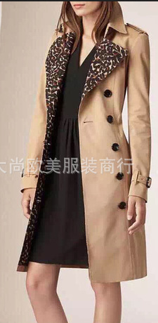 秋季新款 歐美大牌b家高端定制豹紋邊雙排扣中長款風(fēng)衣女代發(fā) /