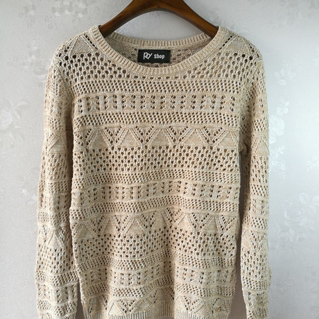 外貿(mào)尾單貨春秋剪標(biāo)女裝純棉鏤空?qǐng)A領(lǐng)針織打底罩衫套頭毛衣杏色 /