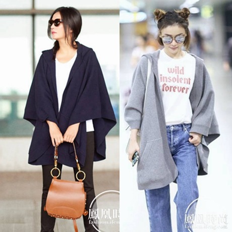 秋冬趙薇袁姍姍同款寬松斗篷蝙蝠衫韓版連帽印花中長(zhǎng)款外套 /
