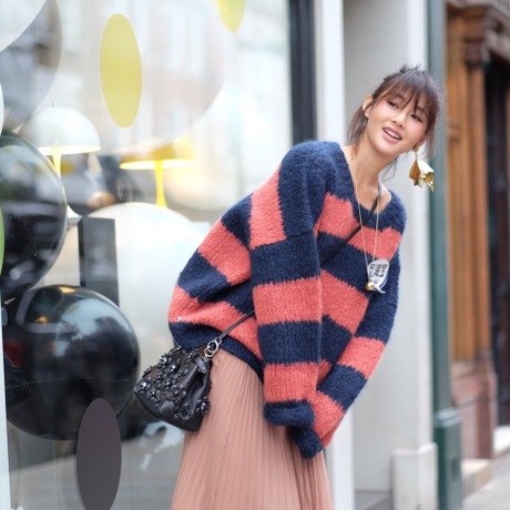 秋冬 陳燃明星同款歐美粗條紋慵懶條紋撞色馬海混紡毛衣 /