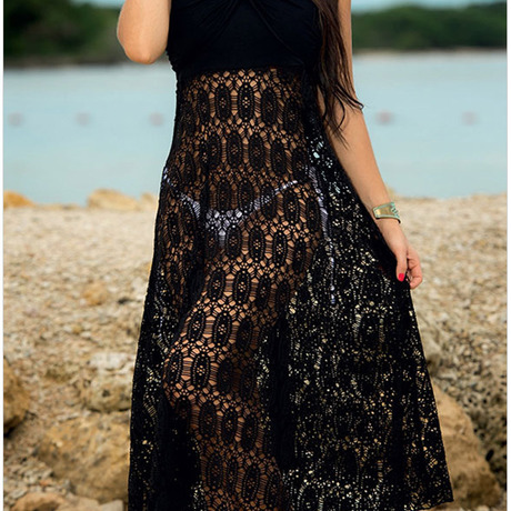歐美風2種穿法蕾絲鏤空性感掛脖度假沙灘裙中裙連衣裙女一件代發(fā) /