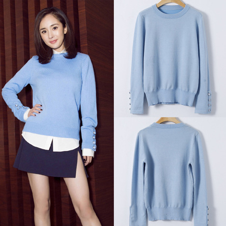 秋季新款楊冪生日同款藍色套頭長袖寬松毛衣女毛衫上衣 /