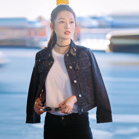 秋季新款時裝周李沁同款MJ時尚米奇繡花長袖黑色牛仔外套女 /