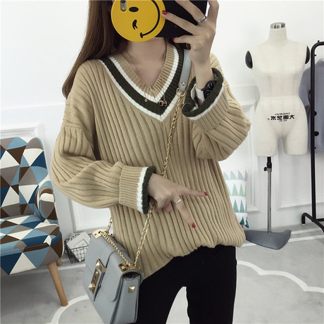 秋裝韓版學院風毛衣套頭女寬松外套春秋秋季新款中長款V領(lǐng)打底衫 /