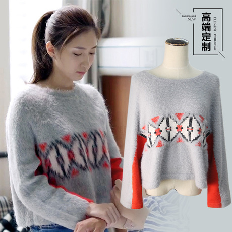 好先生江疏影江萊同款套頭撞色毛衣寬松短款蝙蝠衫長袖幾何紋 /