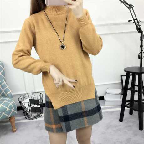 半高領毛衣女修身顯瘦秋冬新款學院打底衫開叉針織衫套頭灰色 /