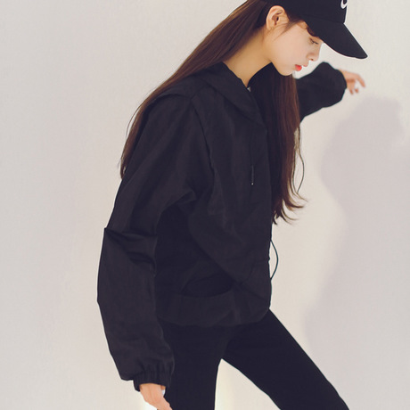 秋季新款 拉鏈系帶連帽黑色長袖外套 韓版寬松顯瘦女士上衣 /