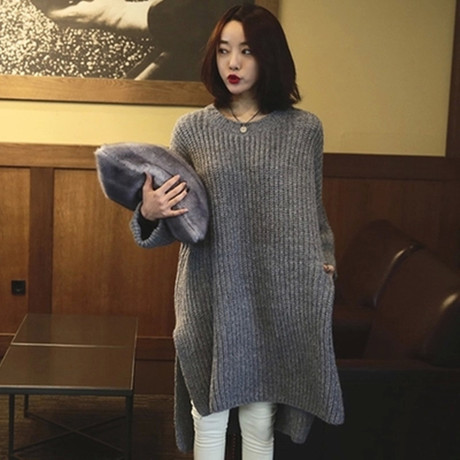 韓國(guó)毛衣女套頭新款寬松中長(zhǎng)款下擺開叉粗針針織衫秋冬女裝外套厚 /