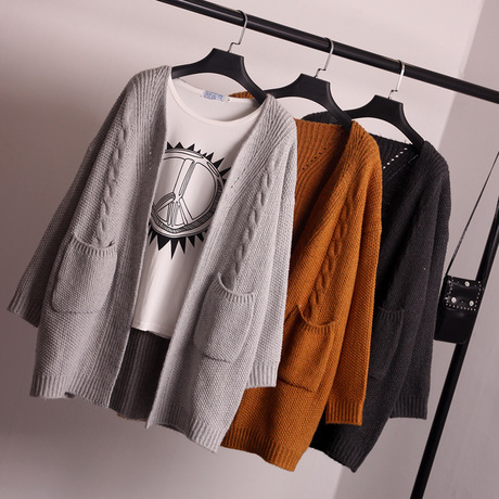 韓國(guó)東大門秋季毛衣女開衫新款寬松粗線針織衫線衣純色中長(zhǎng)款外套 /