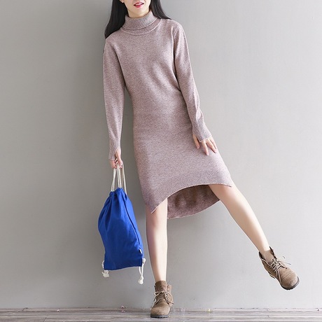 HYS1848 秋冬新款文藝高領羊絨打底中長款純色長袖連衣裙女 /