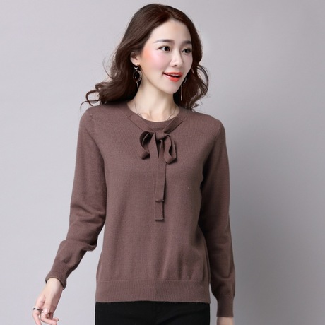 廠家批發(fā)秋新款女式針織上衣 圓領(lǐng)蝴蝶結(jié)系帶修身針織衫 /