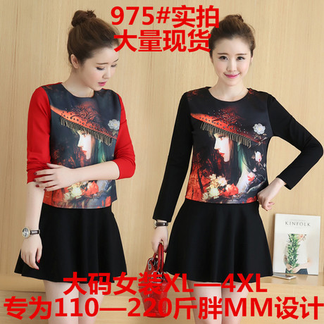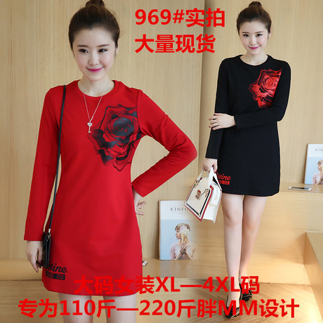 大碼女裝秋裝新款韓版時(shí)尚印花長(zhǎng)袖加肥加大200斤連衣裙 /