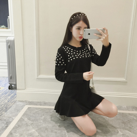 大碼女裝秋裝新款連衣裙加肥加大燙珠連衣裙時(shí)尚黑色連衣裙 /