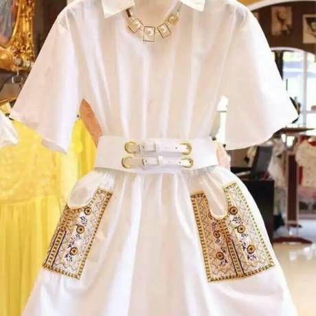 新款 重工刺繡口袋手工穿珠 帶腰帶A字襯衣連衣裙 /