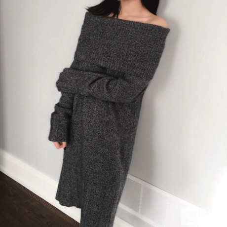 • 高端大牌長款毛衣裙純羊絨衫女大翻領連衣裙露肩寬松毛衣外套加厚 /