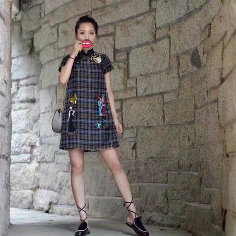 美裳秋冬新款 時(shí)尚優(yōu)雅知性氣質(zhì)款格紋卡通刺繡拼蕾絲邊旗袍 /