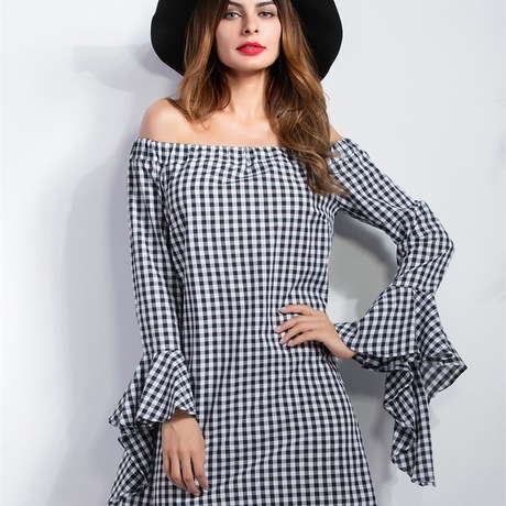 速賣通ebayx秋季新款連衣裙歐美一字領(lǐng)露肩格子飛袖連衣裙 /