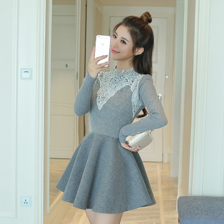 實拍新款甜美修身拼接叼毛鏤空勾花立領長袖打底毛呢連衣裙 /