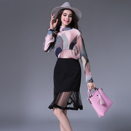 歐美女裝秋季新款優(yōu)雅套裝印花拼接長(zhǎng)袖雪紡衫+魚尾紗網(wǎng)中裙 /