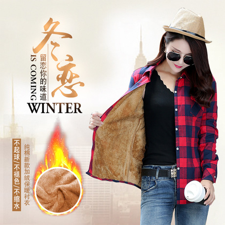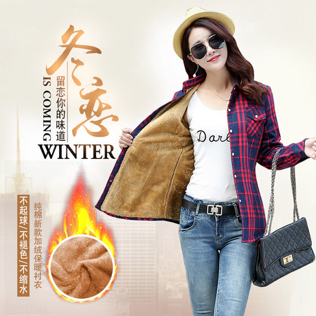 冬季新款純棉格子保暖襯衫女長袖加絨加厚襯衣韓版修身大碼女裝 /