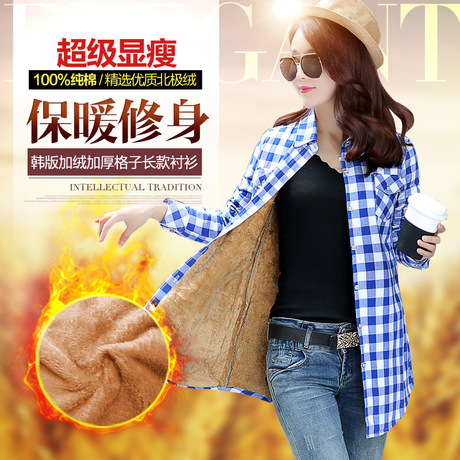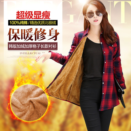 冬季新款 長袖保暖女襯衫加厚加絨格子韓版學生中長款女襯衣 /