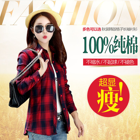 秋裝新款歐美新款純棉格子全棉新打底衫加厚開衫女襯衣襯衫女 /