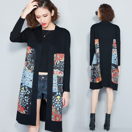 ZC秋季新款民族風(fēng)女裝毛衣開衫 長(zhǎng)袖冰絲針織拼接薄款外套女 /