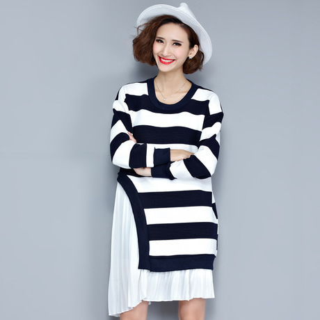 ZC秋季新款韓版女裝連衣裙 長(zhǎng)袖夾絲棉條紋拼雪紡修身女短裙 /