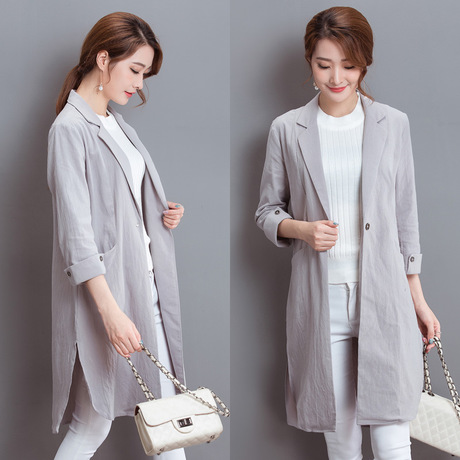 ZC秋季新款韓版女裝長(zhǎng)外衣七分袖棉麻修身中長(zhǎng)款女外套風(fēng)衣女 /