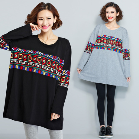 ZC秋季新款民族風(fēng)女裝T恤 長(zhǎng)袖純棉拼接寬松大碼套頭女長(zhǎng)上衣 /
