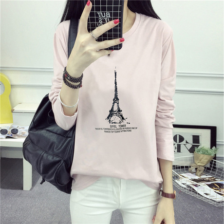 春秋新款女裝韓版寬松鐵塔印花長袖t恤顯瘦打底衫 /