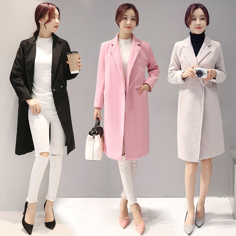冬季長袖中長款修身紐扣純色西裝領(lǐng)雙排扣毛呢外套 /