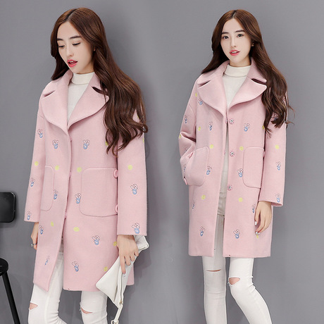 冬季時(shí)尚印花暗扣純色長袖毛呢外套 /