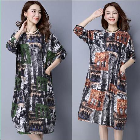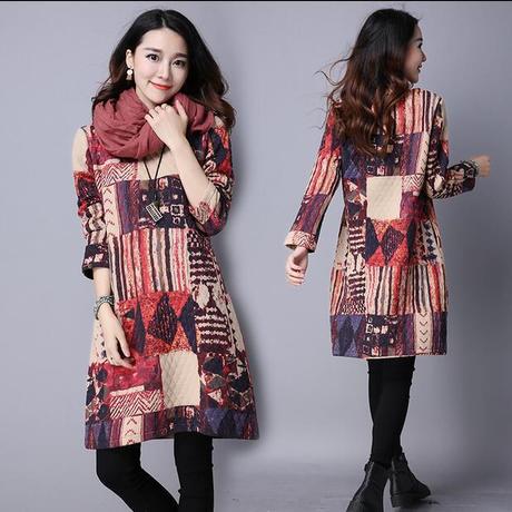 GK秋冬磨毛加厚棉麻民族風復古印花寬松長袖中長款連衣裙896136 /