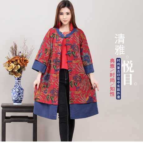 實拍民族風(fēng)秋裝 印花寬松大碼胖MM棉麻盤扣 中袖風(fēng)衣外套女 /