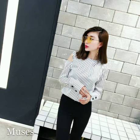 • 歐美秋款 宋慧喬同款 性感露單肩細(xì)條紋真絲斜紋布襯衣女 /