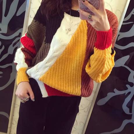 法國(guó)人氣設(shè)計(jì)秋冬新款復(fù)古圓領(lǐng)拼色羊毛混紡針織衫女毛衣上衣 /