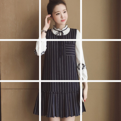 秋新款女裝韓版圓領(lǐng)口袋條紋百褶邊連衣裙自制 /