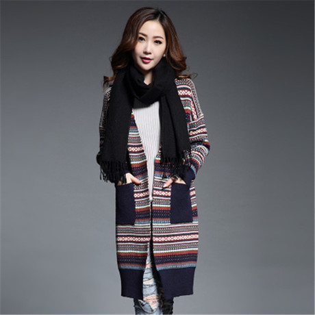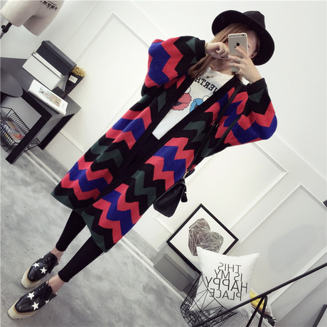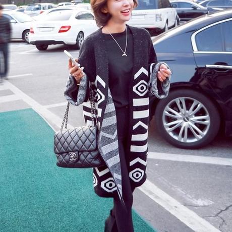 秋冬新款韓版中長(zhǎng)款幾何圖案寬松針織衫開(kāi)衫外套毛衣女 /