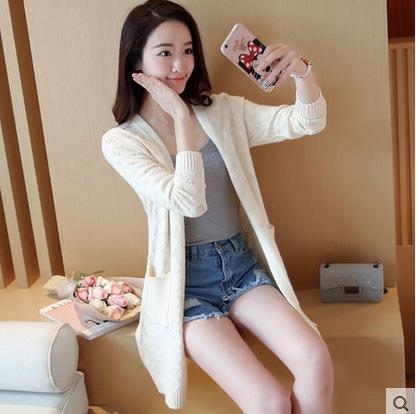 韓版提花針織衫女開(kāi)衫 寬松中長(zhǎng)款V領(lǐng)長(zhǎng)袖口袋薄毛衣外套 /