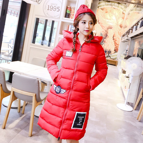 秋冬新款韓版修身中長(zhǎng)款貼布連帽百搭時(shí)尚顯瘦棉衣女 /