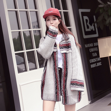 秋冬新款韓版女裝寬松顯瘦中長(zhǎng)款拼色加厚開(kāi)衫毛衣外套女 /