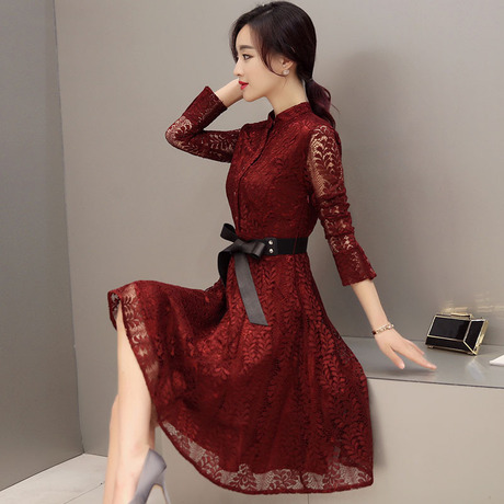 新款春裝時(shí)尚蕾絲中長(zhǎng)款長(zhǎng)袖連衣裙 送腰帶 錦藤依戀JTYL1602 /