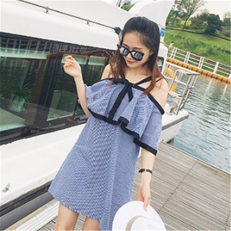 夏季新款女裝寬松顯瘦一字領(lǐng)蝴蝶結(jié)綁帶掛脖荷葉邊格子連衣裙 /