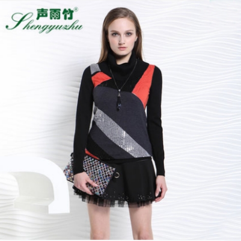 聲雨竹-拼接高領(lǐng)毛衣 /