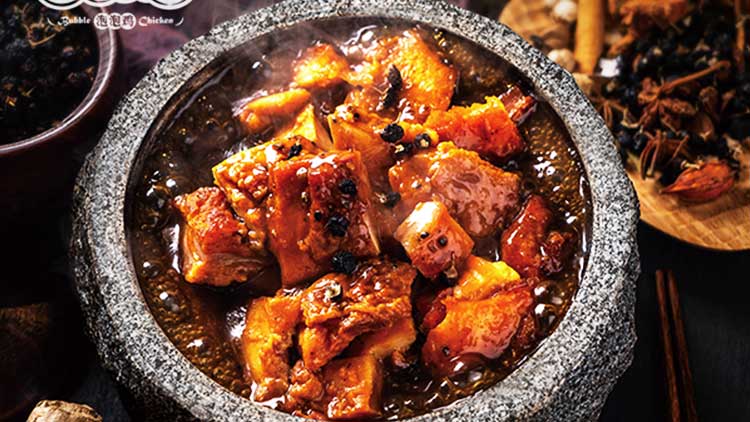 在特制的石釜中,鮮嫩的雞肉正在享受著“藥浴溫泉”。隨著熱力的散發(fā),融入了雞肉鮮味氨基酸的湯汁開始沸騰,咕嘟咕嘟,濃郁的香味隨著一個個泡泡,爆裂中空氣中……